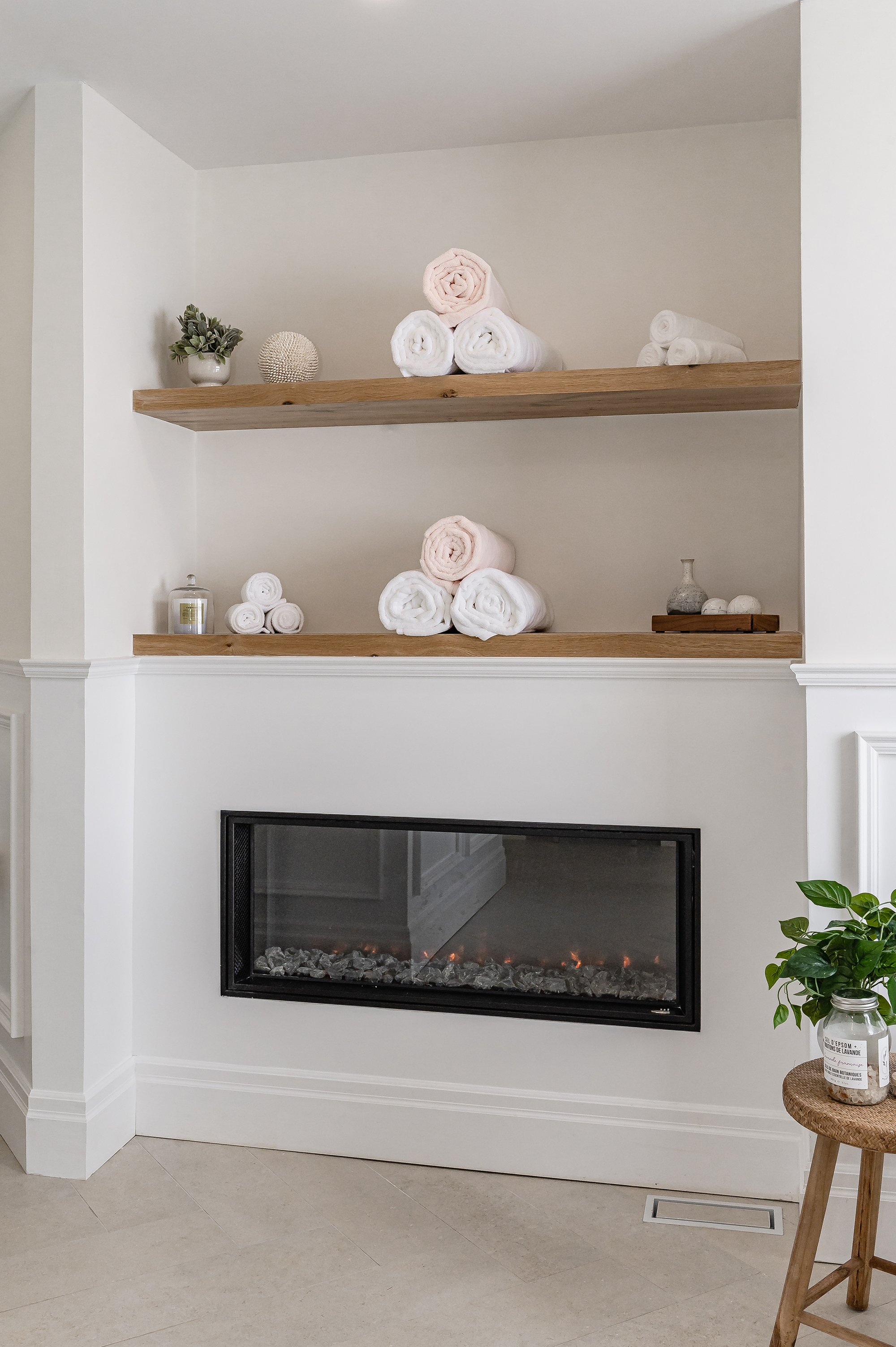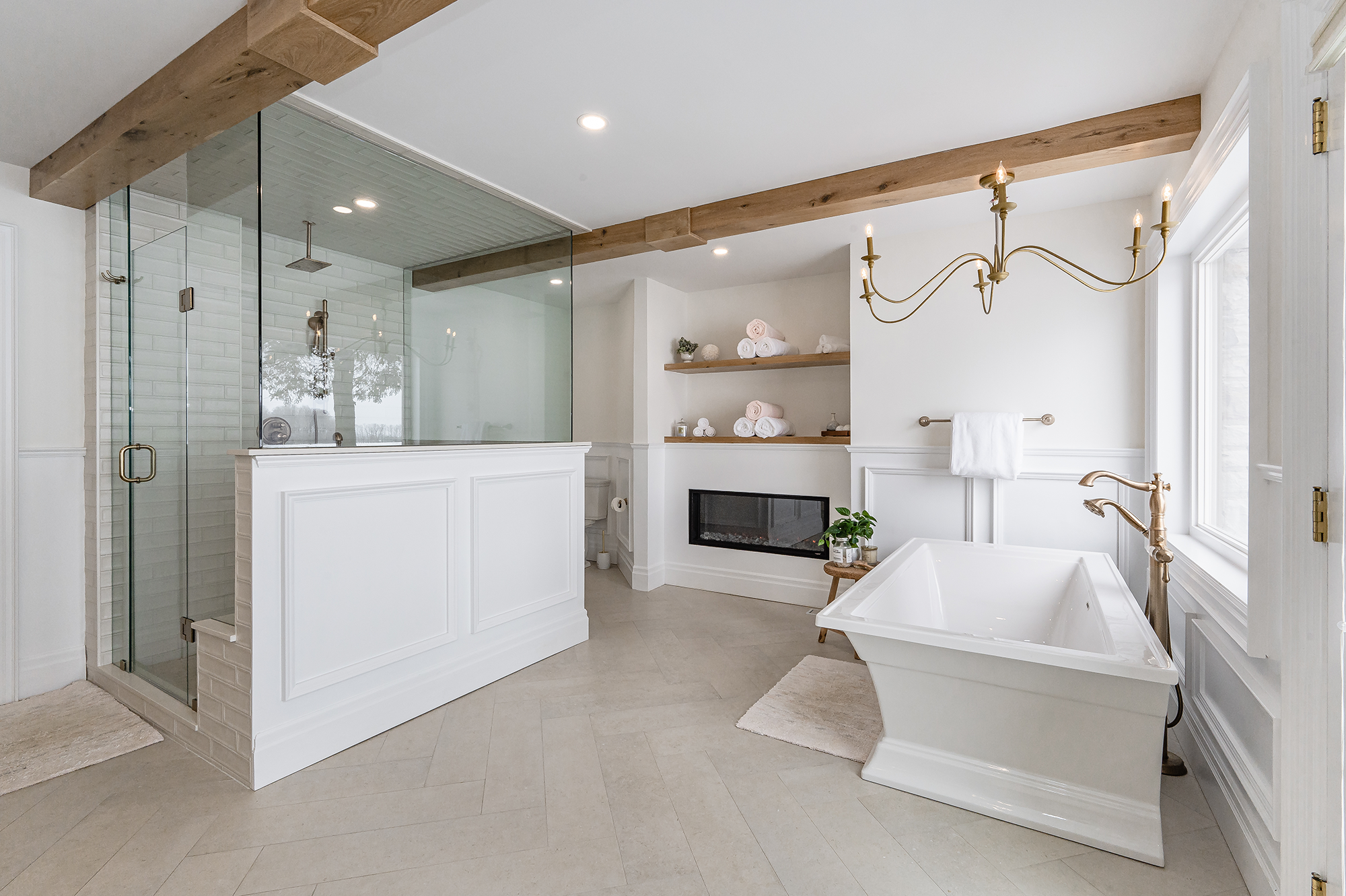 What began as a dated, closed-in bathroom is now a bright, open, spa-like escape. Karry took the space down to the studs and managed every detail of the rebuild, including framing, drywall, plumbing, electrical, and tiling. The result is a true turn-key solution that blends comfort with refined design. A large walk-in shower and a double vanity bring function, while a freestanding soaker tub and cozy fireplace add a luxurious, retreat-like feel. Light finishes and thoughtful layout choices make the space feel airy and timeless—turning an outdated bathroom into a calming, everyday escape.
